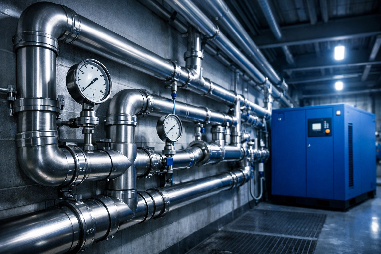 IMAGE: Industrial piping infrastructure showing air distribution system for 16-bar laser compressor