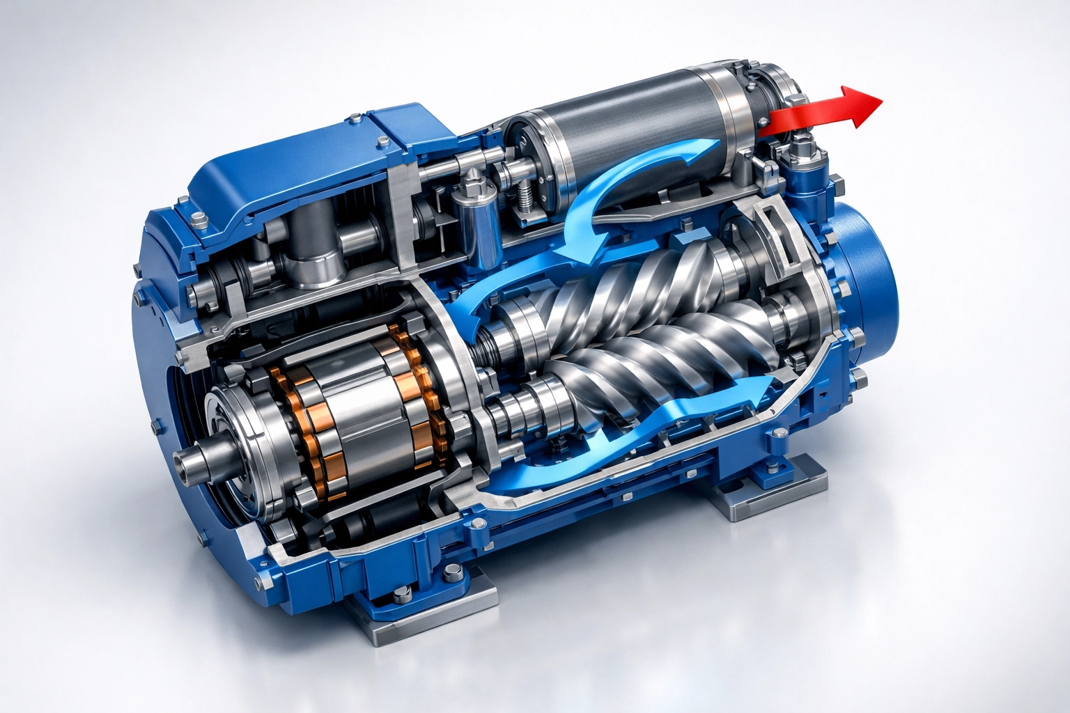 Internal view of screw air compressor showing permanent magnet motor and twin rotors