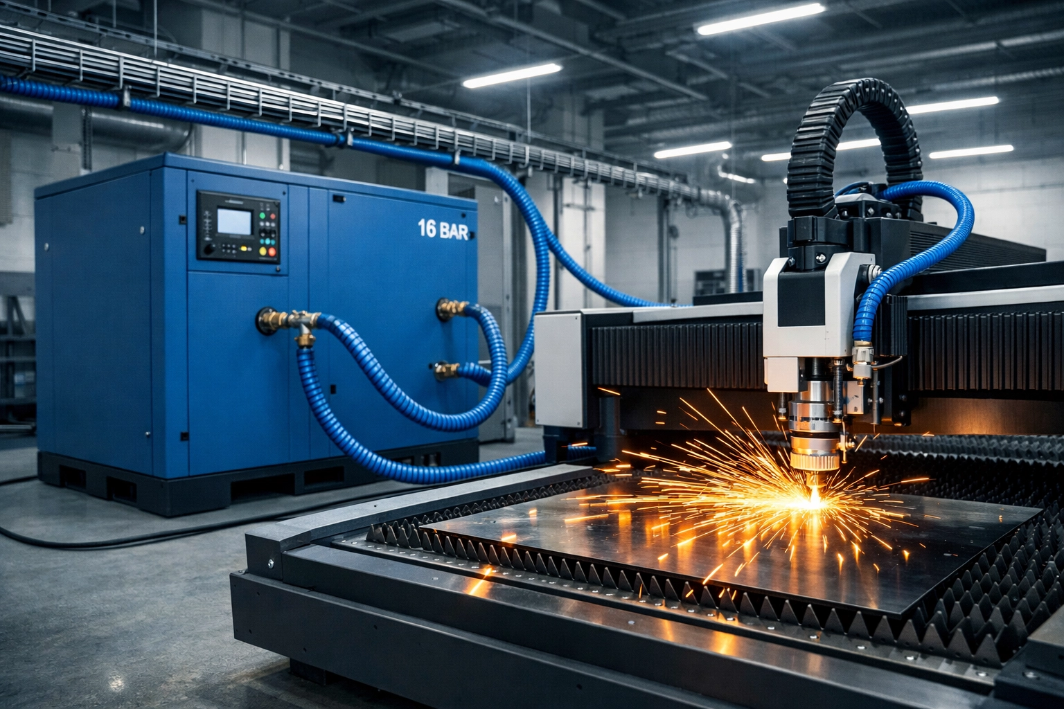 ANSWER: Fiber laser cutting needs a dedicated 16 bar-class air system that can hold stable pressure at the machine inlet while delivering high flow and very dry, low-oil compressed air to protect optics.