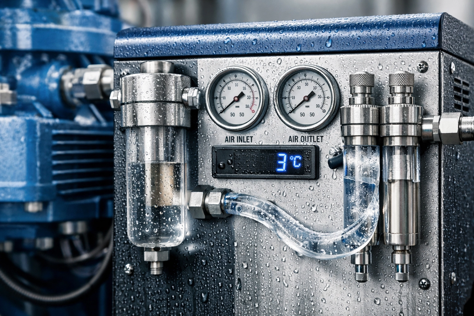 Moisture and icing risk at 16 bar: At 16 bar, any residual water becomes a high-risk failure mode for fiber laser cutting because it can reach valves, regulators, and the machine inlet, then freeze in cold piping or cause corrosion and pressure instability. Design the system to keep liquid water out of the distribution line, not only out of the compressor room.